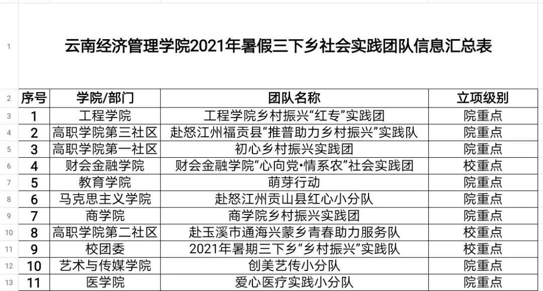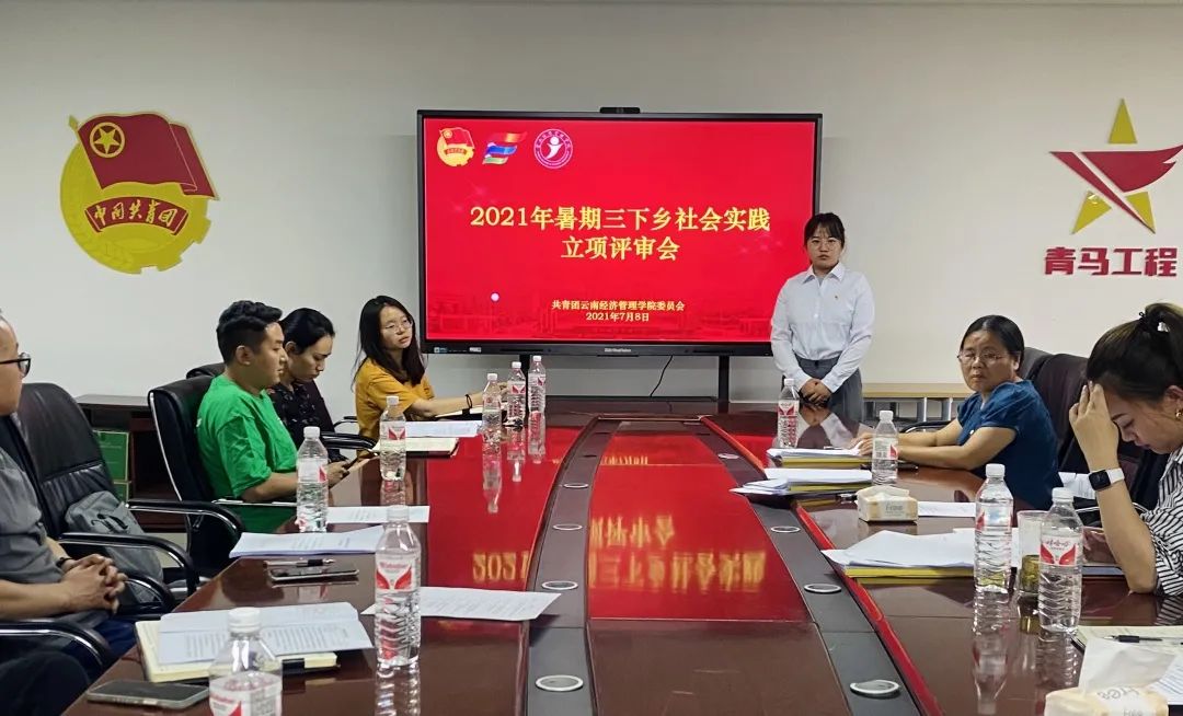 为深入学习宣传习近平新时代中国特色社会主义思想,全面落实全国高校思想政治工作会议精神和全国教育大会精神,积极引导大学生在社会实践中担当责任、练就本领、锤炼品德,结合中央宣传部、中央文明办、教育部、共青团中央、全国学联联合下发的《关于开展2021年全国大中专学生志愿者暑期文化科技卫生“三下乡”社会实践活动的通知》与中共云南省委教育工委下发的《关于开展2021年“小我融入大我·青春献给祖国”党史学习教育实践活动》与中共云南省委宣传部、云南省文明办、中共云南省委教育工委、共青团云南省委、云南省学生联合会联合下发的《关于开展2021年全省大中专学生志愿者 暑期文化科技卫生“三下乡” 社会实践活动的通知》与我校《共青团云南经济管理学院委员会 云南经济管理学院马克思主义学院关于组织开展2021年暑期“三下乡”社会实践活动的通知》的要求,特以此举办“党的恩情照边疆 经管青年心向党”2021年暑期三下乡社会实践队伍立项评审会,本次评审会共有11支队伍,2021年7月8号在我校青年之家会议室展开。