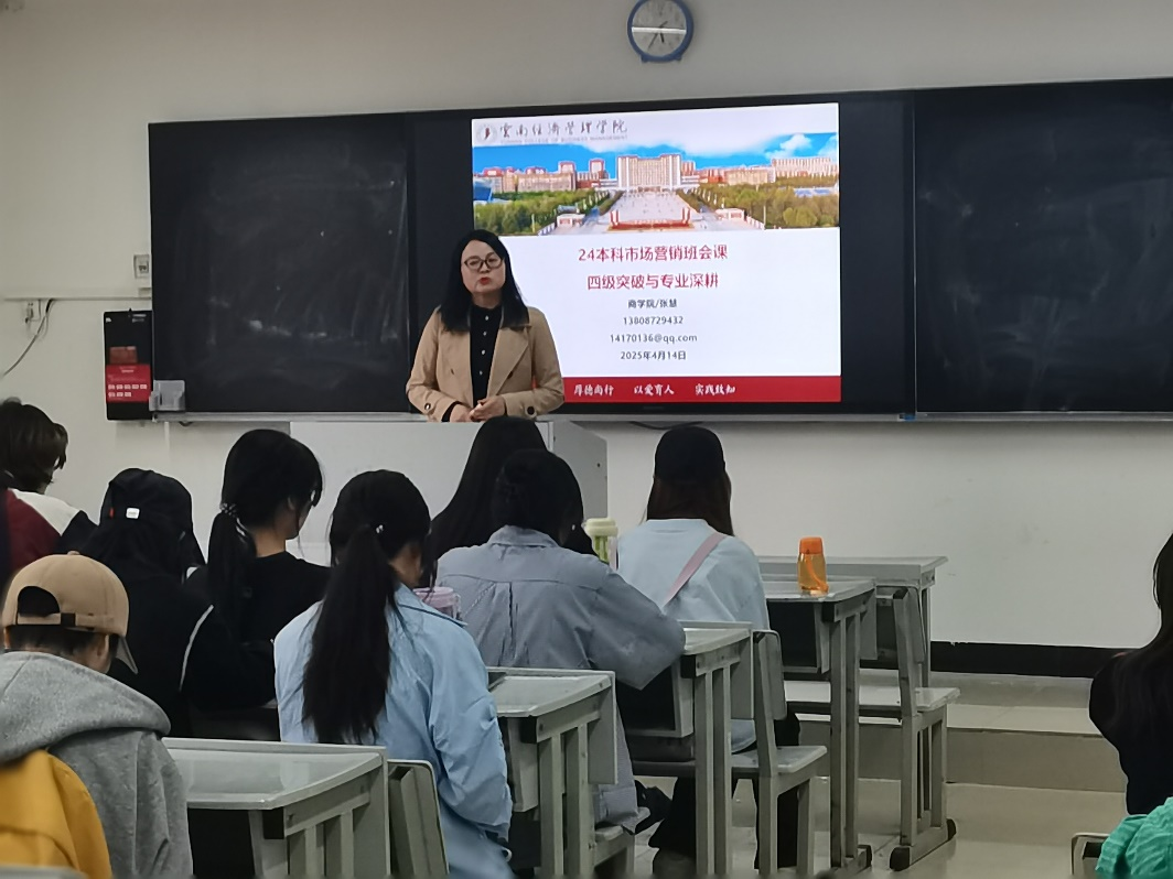 - 从四级冲刺到专业深耕——导师引领24市场营销班逐梦前行2025 年 4 月 14 日下午,商学院 24 本科市场营销班迎来了一场意义非凡的班会。本次班会由学业导师张慧老师精心组织,主题为“四级突破与专业深耕”,旨在为同学们的学业发展提供明确的方向和有力的支持。班会开始,张慧老师聚焦于英语四级考试这一重要关卡。她指出,英语四级是每位大学生必须跨越的门槛,对于未来的职业发展和个人成长都有着不可忽视的影响。为了帮助同学们顺利通过四级考试,张老师分析了所有学生的英语四级成绩,并调研了学生的想法,将以往成