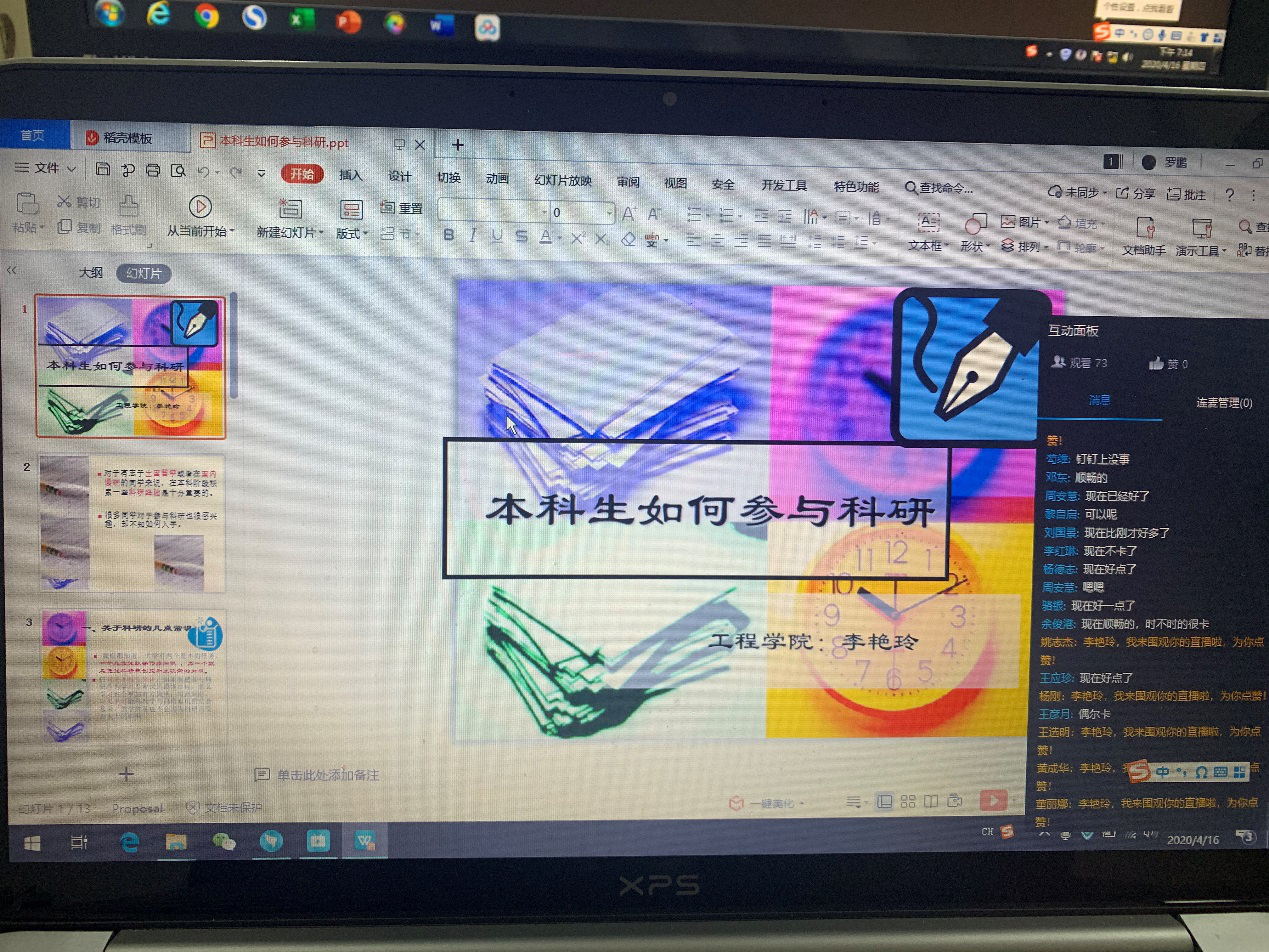 今年是特殊的一年,鉴于疫情发展,我们都还未开学。工程学院科研小组成立后的第一次培训活动于2020年4月16日晚上7点在钉钉直播开展。此次培训的主题为“本科生如何开展科研活动”。