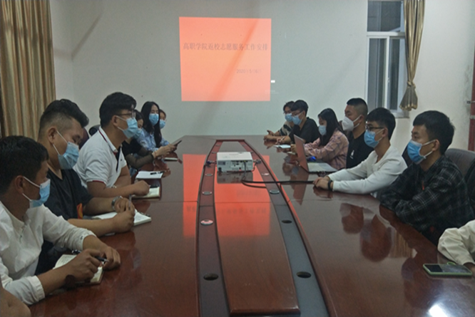 - 2020年5月6日下午,高职学院返校志愿服务队在19栋323会议室召开工作安排例会。高职学院领导,高职学院返校志愿者参加会议,会议由高职学院团委书记杨金钰主持,高职一社区团委书记韩帆、高职二社区团委书记孙本彦、高职三社区田小念同志作工作要求。 会议初始,由高职学院各社区团委书记对此次返校志愿服务工作进行了相关布置与安排。一、志愿者参与早晨升旗仪式;二、检查志愿者口罩使情况;三、参与返校志愿者培训;四
