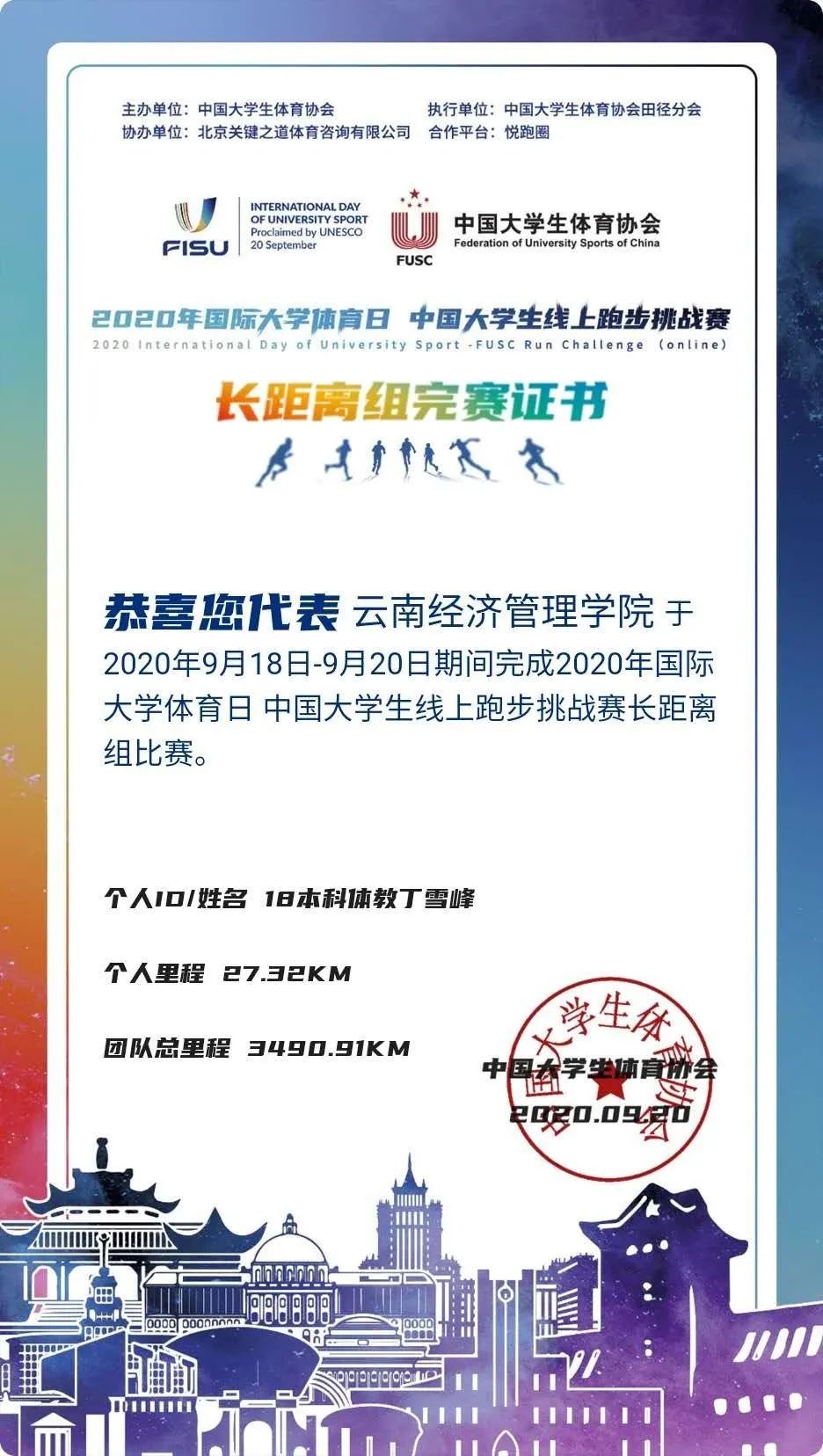 9月20日是“国际大学体育日” 由中国大学生体育协会主办,北京关键之道体育咨询有限公司协办,中国大学生体育协会田径分会执行的国际大学体育日 中国大学生线上跑步挑战赛于9月18日至20日在悦跑圈APP上举行。