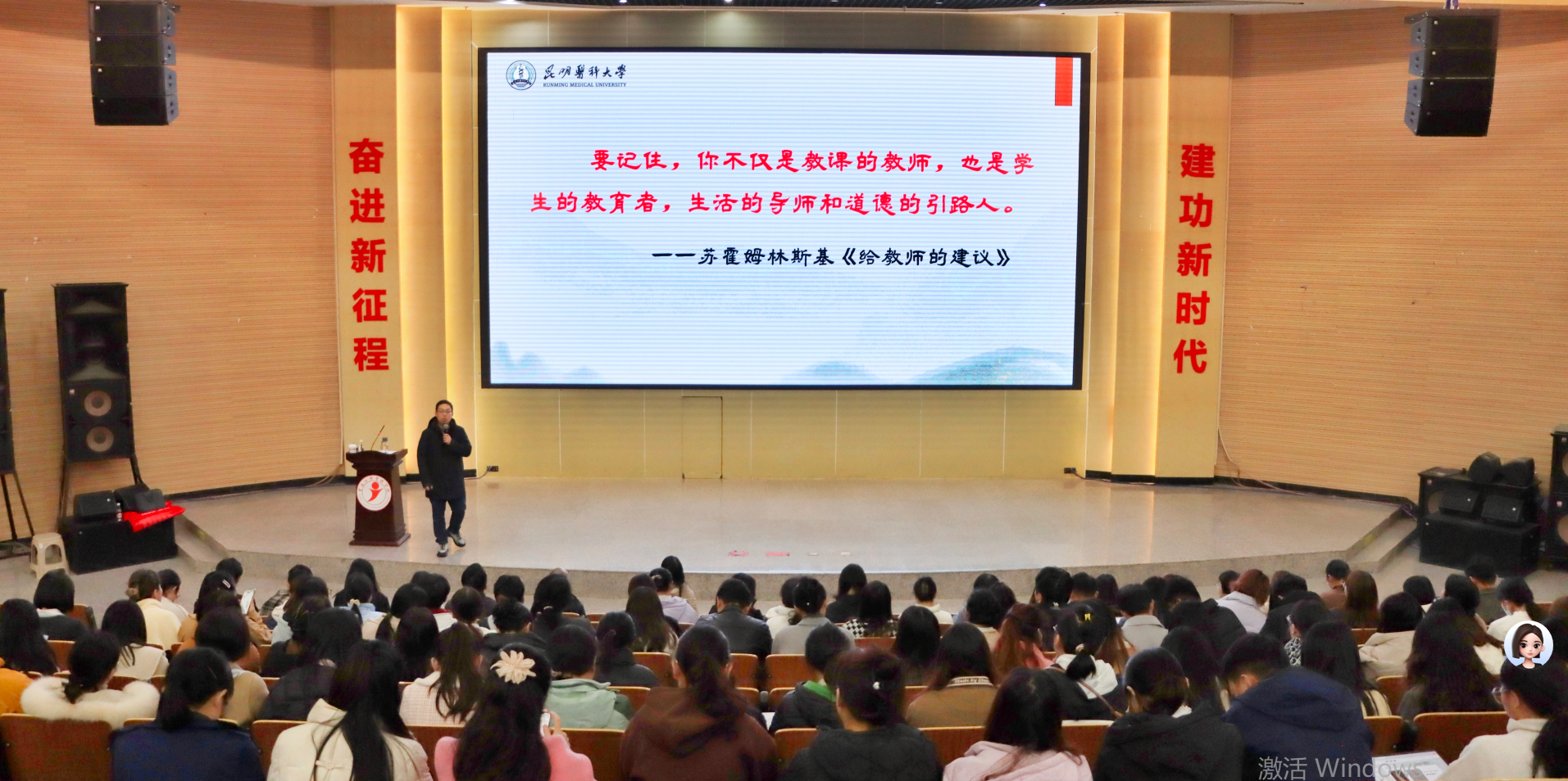 - 2025年11月4日下午,云南经济管理学院800人报告厅内暖意融融、氛围庄重,一场以“立师德、正师风,做新时代医学教育幸福引路人”为主题的师德师风专题培训在此拉开帷幕。本次培训特邀昆明医科大学陈志鹏老师主讲,医学院全体教职工齐聚一堂,共同聆听这场兼具理论深度与实践温度的精神洗礼。 培训伊始,云南经济管理学院医学院党总支彭轶书记代表学院向陈志鹏老师的到来表示热烈欢迎,并结合医学教育的特殊性与时代使命,阐明了本次师德师风培训的重要意义。她指出,医学教育承载着“健康所系、性命相托”的厚重责任,