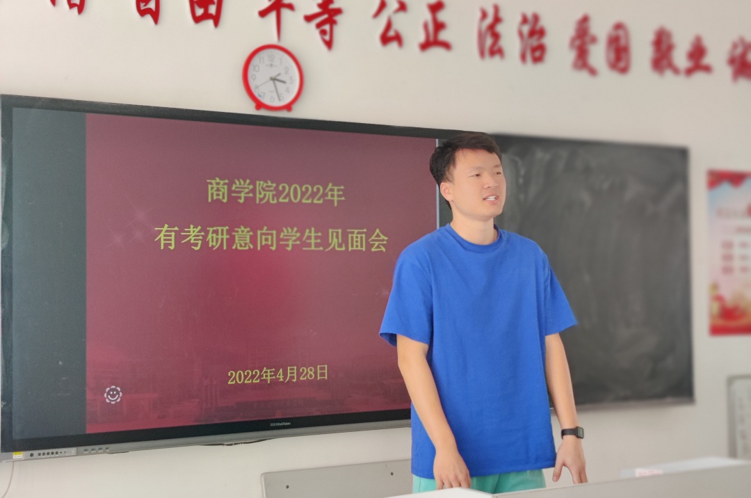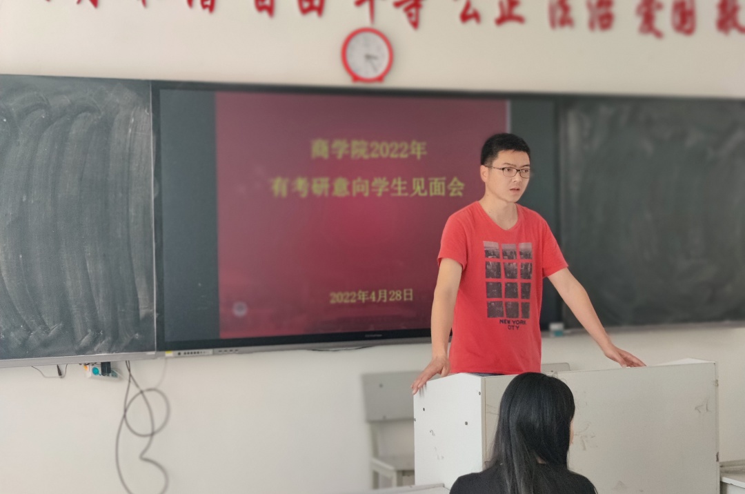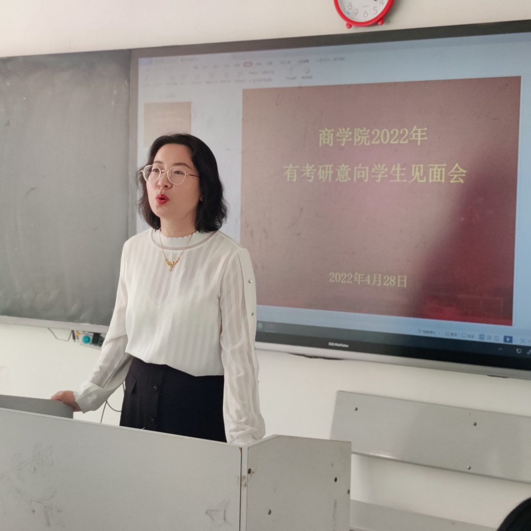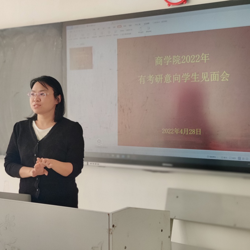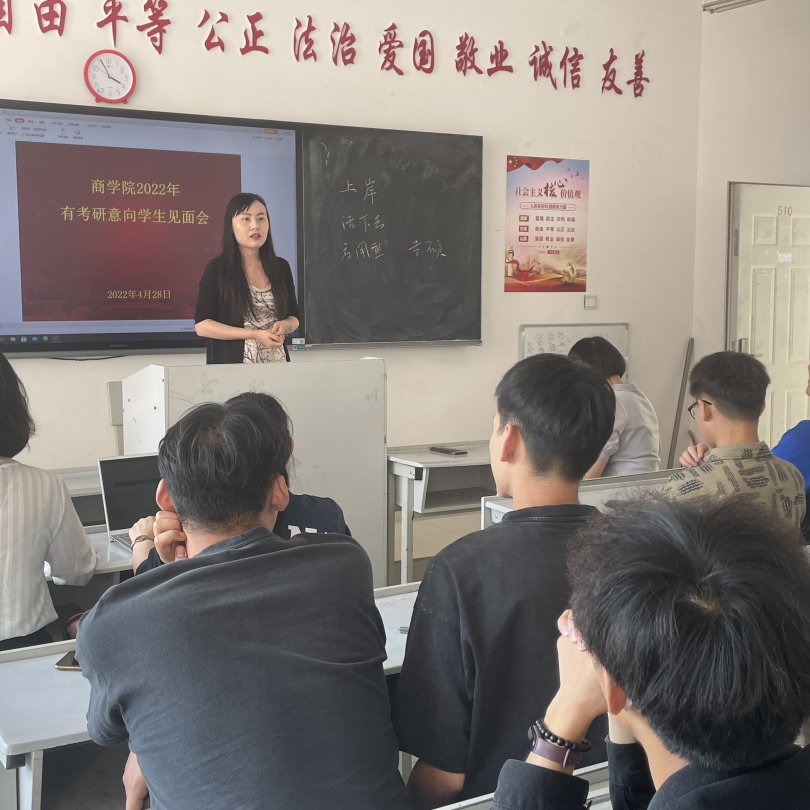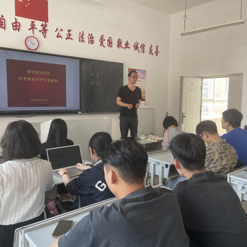 为了帮助19级本科、21级专升本同学有考研意向的同学尽快进入考研状态,2022年4月28日下午,商学院在一教510召开了2022年有考研意向学生见面会。学院执行院长王一涵、市场营销专业负责人龚顺强、电子商务专业负责人蒋媛媛、酒店管理专业负责人任海珠、法学专业负责人史琳等老师出席了见面会,2019级本科、2021级专升本意向考研的同学们参加了会议。会议由学生科长段晓涛老师主持。